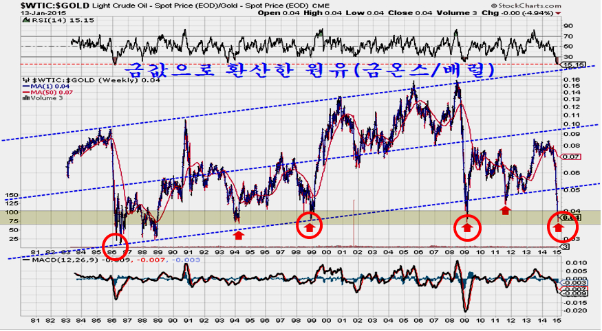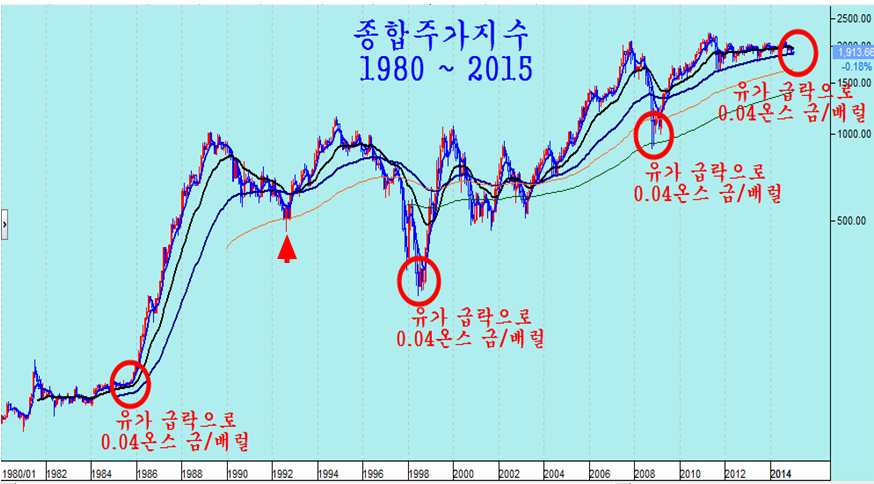 유가 급락으로 위기 국면이 고조되며 금을 기준 0.04온스 근처의 가격으로 하락했던 1986년, 1998년, 2008년은 우리나라 주식 역사상 가장 주가가 크게 오른 기회에 해당하는 저점 이었다. 원자재 가격 하락에 의한 세계 경기의 회복국면과 원자재를 수입하여 가공하여 수출하는 산업을 주력으로 하는 우리 산업 구조를 볼 때 이는 당연한 흐름이다.