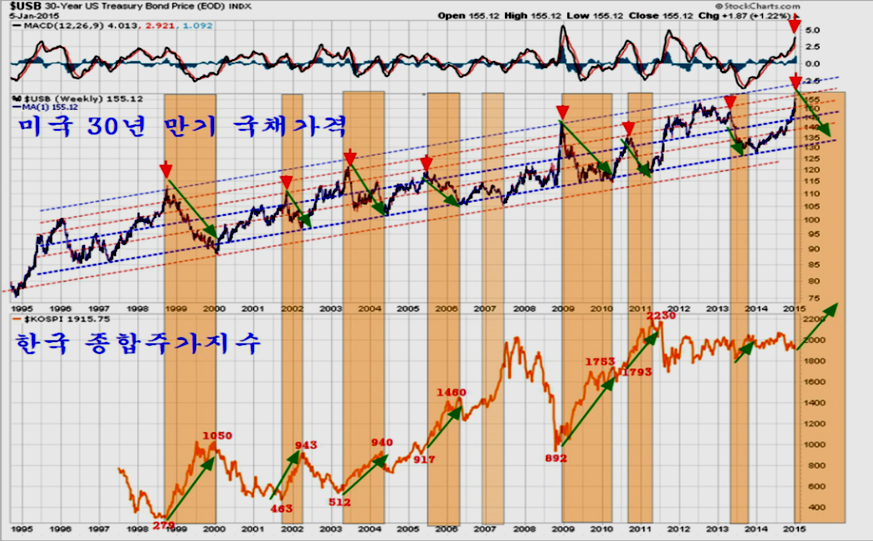 이런 세계 자금시장의 특성 때문에 미국 국채와 한국의 종합주가지수는 밀접한 관계로 밀당하는 것처럼 나타나며, 특히 국채가격이 크게 하락할 때 종합주가지수는 대단히 큰 상승이 나타난다. 이것은 한국의 주가를 움직이는 주체가 기관이 아니라 외국인이었다는 점에서 이해하기 쉽다.