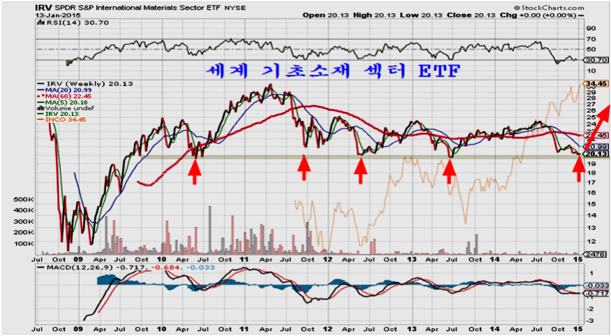 상품지수는 2001년 911 테러시의 저점과 2008년 금융위기의 저점을 잇는 채널 하단에 이르러 있으며 이를 기점으로 상승으로 전환되기 쉽다.