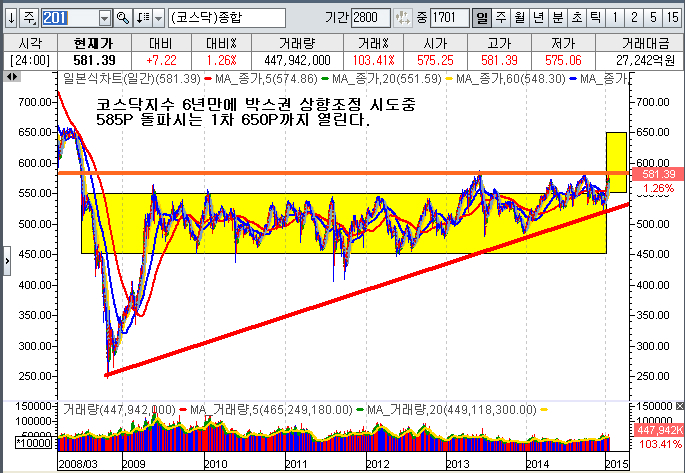 코스닥지수가 가파른 상승세를 지속하면서 최근 박스권 상단인 585P를 돌파를 목전에 두고있다.