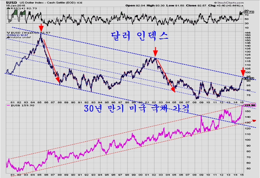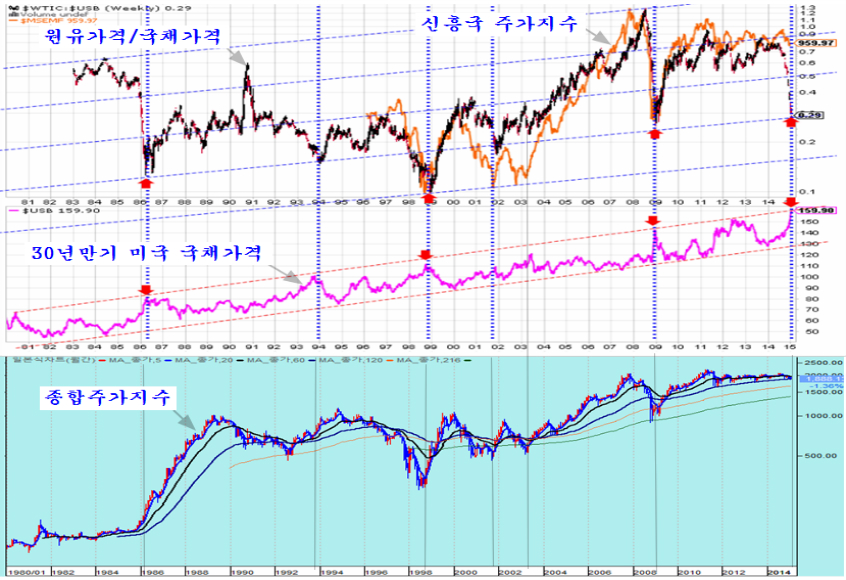 다음은 미국의 국채를 팔아서 원유를 살 때를 가정하여 원유가격을 미국 국채가격으로 나눈 그래프와 미국의 30년만기 국채가격, 그리고 신흥국 주가지수, 한국의 주가지수를 1980년 ~ 2015년의 35년에 걸쳐 그린 것이다.