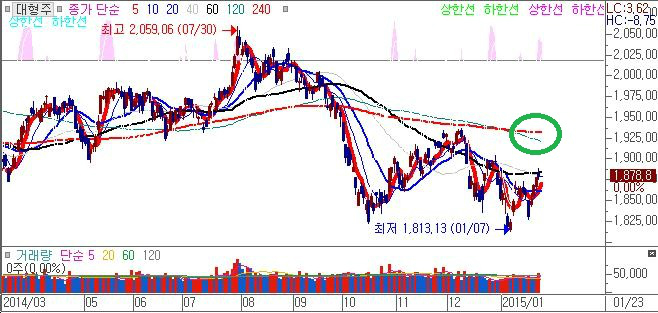 그런데 상단을 보면 경기선이라 할수있는 120선의 하락각 형성과 주요 저항선인 240일선이 현재보다 상단 2.81%에