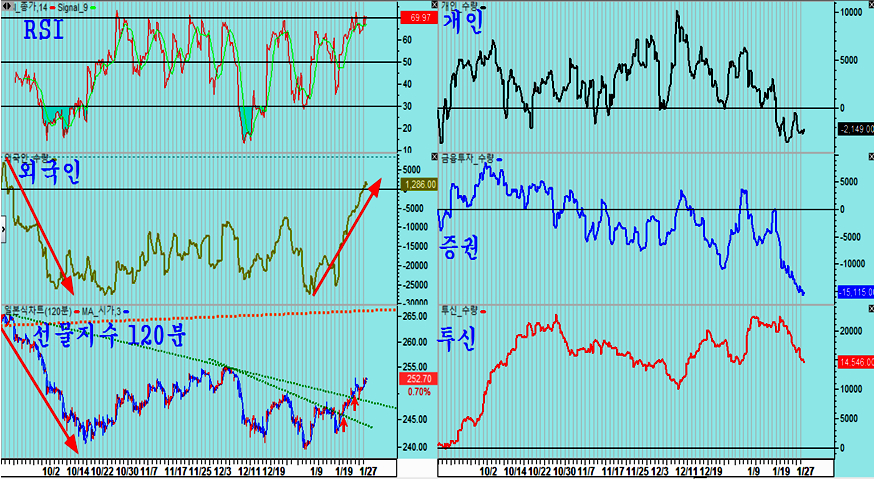 외국인의 매매 추세로 보면 외국인은 그간 단기 등락과 함께 옵션 게임을 하던 전략에서 벗어나 추세를 대비하는 포지션을 가져가고 있지만, 6개월간의 학습으로 단기 거래에 익숙한 개인과 기관이 아직 이런 눈치를 채지 못한 것 같다.