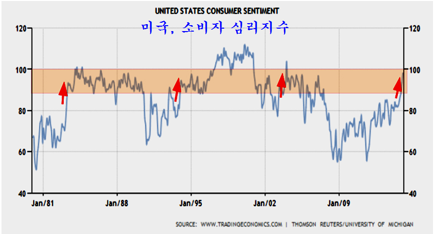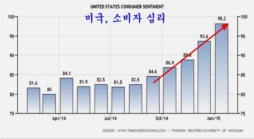 지난해 4분기 이후 미국 소비자의 소비심리가 대단한 속도로 호전되고 있다. 8월까지 82 수준에 정체하던 소비자 심리가 9월 이후 가파른 상승과 함께 올 1월 98을 넘어섰다.