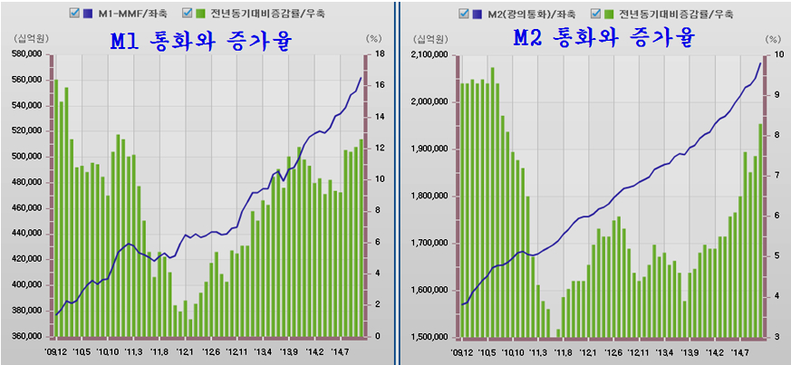 이런 통화 공급 대열에 한국도 합류하고 있다. M1 통화량 증가율이 12%를 넘어서고, M2 통화량 증가는 대출 증가와 함께 가파르게 증가하여 8%를 넘어섰다. 물가상승률을 제외하고 6%대 GDP 성장이 나올 수 있는 강한 통화확대 국면이다.