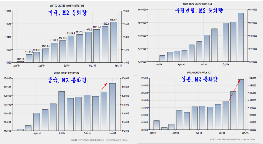 한편, 각국 중앙은행도 지난해 연말부터 발 빠르게 돈을 시중에; 풀고 있다. 세계 4대 경제권인 미국, 유로존, 중국, 일본이 모두 통화 공급을 늘려 M2 통화량이 눈에 띄게 증가하고 있다. 세계 경제 비중이 큰 나라부터 차근차근 지표를 돈으로 덮고 있다고 하겠다.