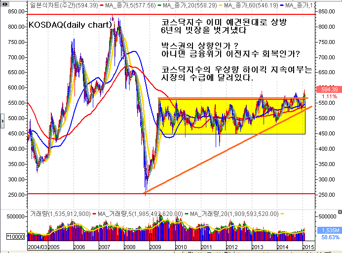 코스닥지수 아직도 추가적인 상승 가능성이 열려있다. (아래 코스닥지수 차트를 보시기 바란다)