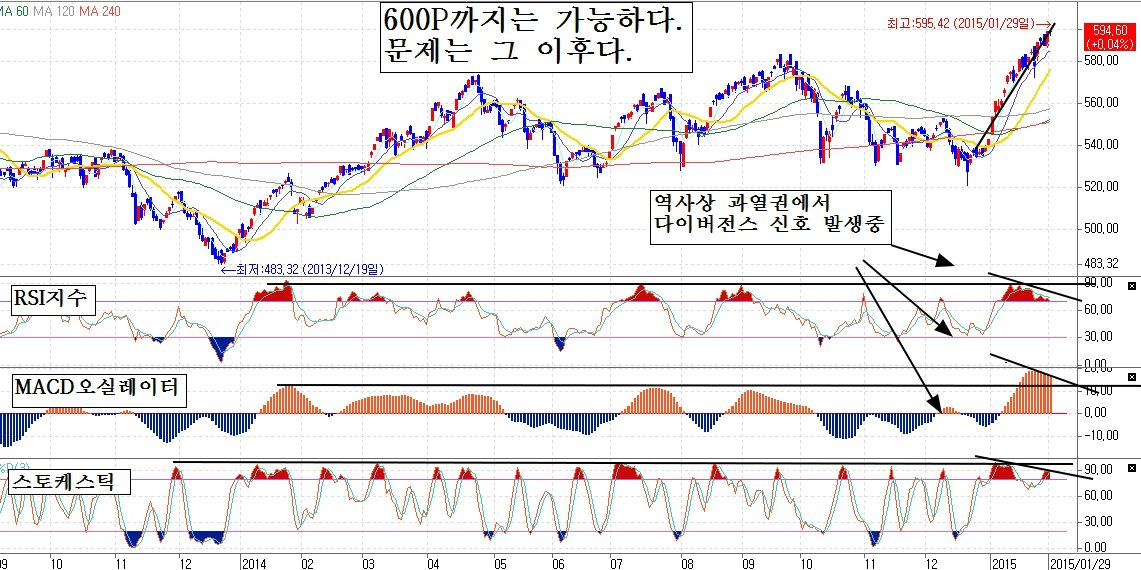 안녕하세요! 페라리 입니다. @페라리 무료방송 ★시소게임을 잘해야 돈을 벌 수 있다. 한국의 주식시장은 대형주와 중소형주의 시소게임이 항상 진행된다. *시소게임의 순서 외국인이 시장을 매수하면 대형주 위주로 상승하게 되고 시중의 자금이 부족할때는 중소형주를 매도하면서 까지 대형주를 매수하므로 중대형주와 소형주의 양극화 현상이 뚜렷해지게 된다. 아무리 대형주고 좋다해도 대형주가 끝없이 상승할 수는 없다. 대형주도 많이 상승하게 되면 어느순간 비싸다는 생각이 들게되고 상대적으로 하락했던 중소형주는 싸다는 생각이 들게 된다. 그래서 포트변경이 발생하게 되는 것이다. 지금은 3번 단계에서 4번 단계로 넘어가는 초기단계로 판단된다. 중소형주 매매는 신중해야 할 것으로 보인다. 탄력도를 강조하는 이유다. 단. 투기적인 테마주들은 이시기에 강세를 보인다. (전쟁, 대북, 대선.질병, 재난관련주등등) 단.코스닥 파동을 볼때... 2월은 조정파가 나올 수 있으나 4월은 다시 강세를 보일 수 있다는 점. 즉, 3에서 4로 가다 다시 3으로 갈수도 있다고 본다. *코스닥 600p까지는 갈수 있으나.. 그 이후가 부담이 된다. 바로 다이버전스 신호가 발생하고 있기 때문이다. 거래소는 지수가 하락중이라 하락종목이 많은게 당연할 수 있다. 하지만 코스닥은 최근 몇일동안... 지수는 상승하지만 하락종목이 많아지고 있다. 지수가 상승하고 않하고가 문제가 아니라 돈을 벌 수 있고 없고가 중요한 것이다. 지금은 지수가 상승해도 큰 수익을 기대하기는 어려운 시기라 판단된다. 금일 코스닥 지수는 상승중이나 하락종목수가 100개가 많은 상황이다. 상승하는 종목들도 겨우겨우 상승의 명목만 유지할뿐.. 탄력도는 급격히 떨어지고 있다. *코스닥 다이버전스 신호 발생. 중소형주의 탄력도가 크게 떨어지고 있는데 그와 함께 코스닥 지수에 다이버전스 신호가 발생하고 있습니다. 다이버전스란 추세역전을 말하는데 이것은 가격의 고점은 높아지고 있지만 보조지표의 고점은 낮아지는 것입니다. 이런 현상이 발생하게 되면 가격은 머지않아 조정국면에 진입하게 됩니다. *다이버전스의 실예. *최근 코스닥의 보조지표를 보면.. 다이버전스가 심해짐을 볼 수 있습니다. 보조지표는 절대 신뢰할 수 없지만 다이버전스 신호만큼은 반드시 활용해야 한다. 시장이 변하기 시작하면 대응할 시간이 없을수도 있다. 그래서 페라리 클럽은 포트에 대규모 변경을 주고 있다. 골든타임을 잘 활용하시기 바란다. 12월부터 1월까지 페라리클럽의 누적수익율은 무려 450%를 기록했다. 이제는 고수익 보다는 안정적 수익을 추구할때라 판단된다. 12~1월까지 페라리클럽의 누적수익율은 450%를 기록했지만 지난주 부터 공격보다는 방어시스템을 가동시키고 있습니다. *실제 증거자료 보러가기=>50일 누적 450% 트루윈 40% ,YG플리스 24%, 한국화장품 40%, 리홈쿠첸 22% 미디어플렉스 45%, 루멘스 38%, 인터플렉스 40%, 와이솔 23%, 에스맥 15%,아이리버 38%,마크로젠 20% 상승등등 폭발하고 있다 1월이 가기전에 반드시 가입해 두시기를 권한다.
