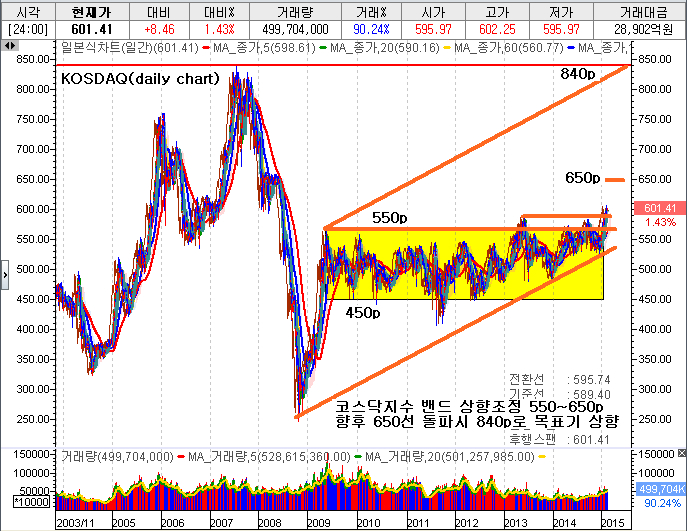 코스닥지수가 기술적으로 대세 상승국면의 초입에 이미 진입하였습니다.