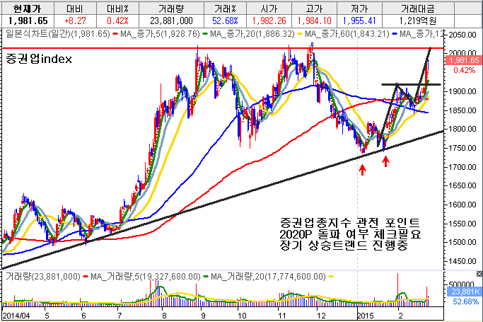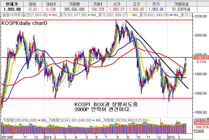 코스피지수가 최근 5개월여간의 박스권 상단부인 2000p돌파직전에 있으며 이후에 돌파시도가 이어질것으로