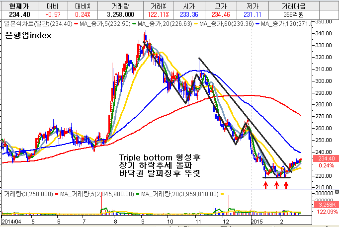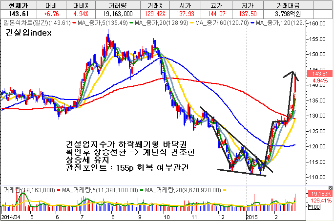 가장 흐름이 앞서가는 것이 증권업이고 그다음이 건설업 그리고 이제 상승전환을 시작하는 것이 은행업