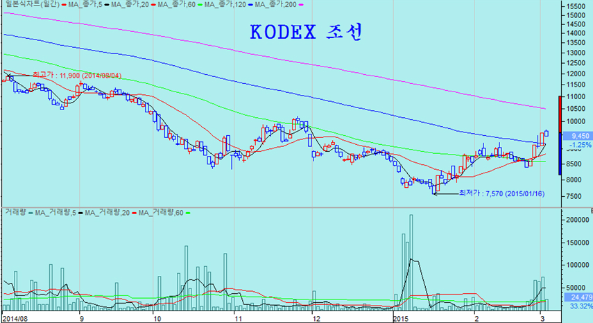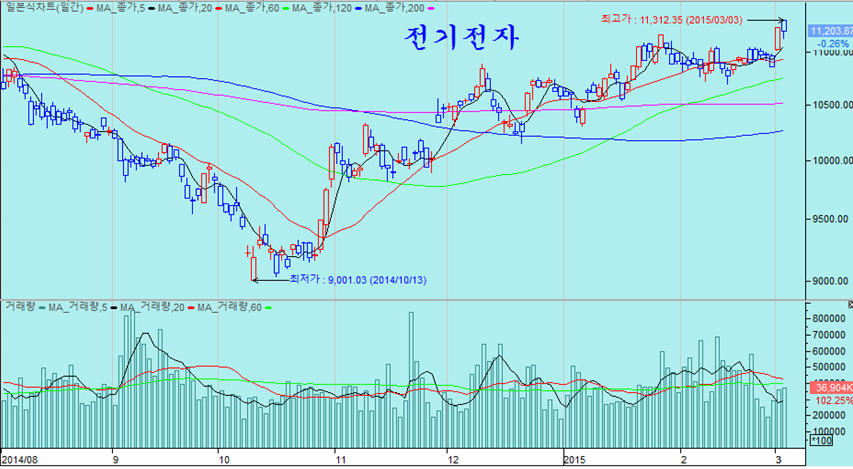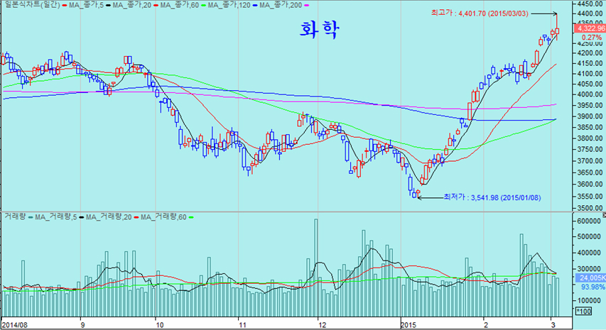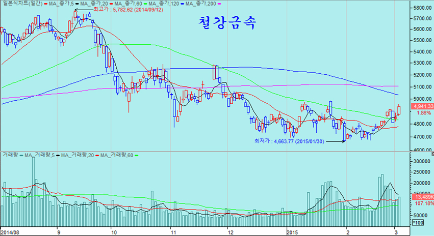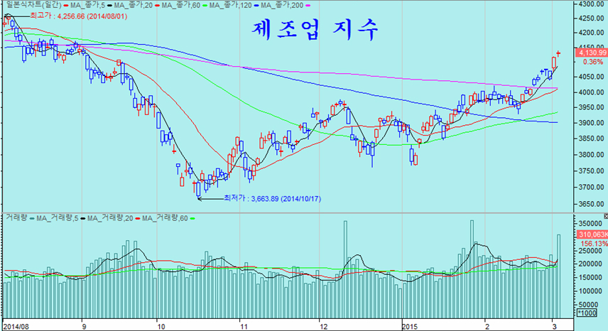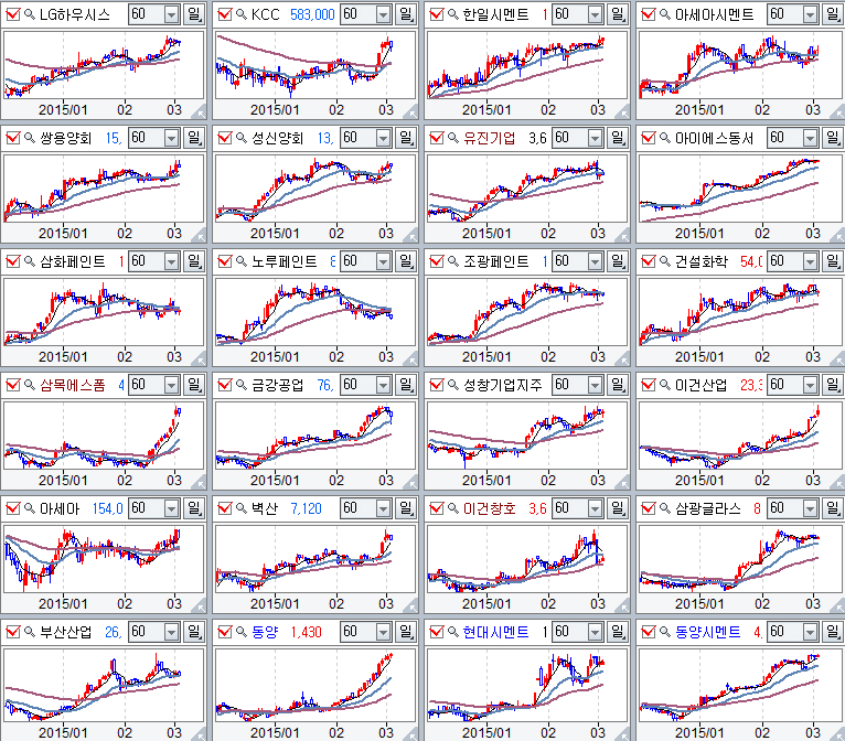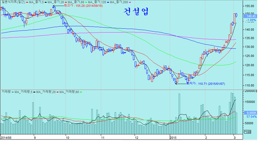 국내 주택 시장의 수요 우위의 전환과 주택 분양시장의 활황과 함께 건설업종이 강세가 이어지고 있어 증시 삼각편대의 선두를 유지하고 있다. 여기에는 건설주와 건축자재가 관련되어 향후 지금과 앞으로 분양될 아파트가 계약금에서 중도금 그리고 잔금을 치를 때까지 지루하고 긴 상승을 남겨 두고 있다.