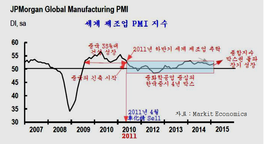 2011년 7월 중국의 건설 경기 급랭으로 인해 세계 제조업 경기 성장이 감속 둔화되면서 화학, 철강, 기계, 조선, 건설, 운수 업종이 장기 약세를 시작했고, 바로 이 업종들을 중심으로 한 중화학 공업 기반의 한국 증시는 그나마 삼성전자와 자동차 등으로 경기 민감주 하락을 보상하며 지루한 박스권 정체가 이어졌다.