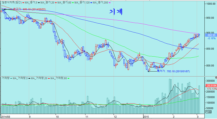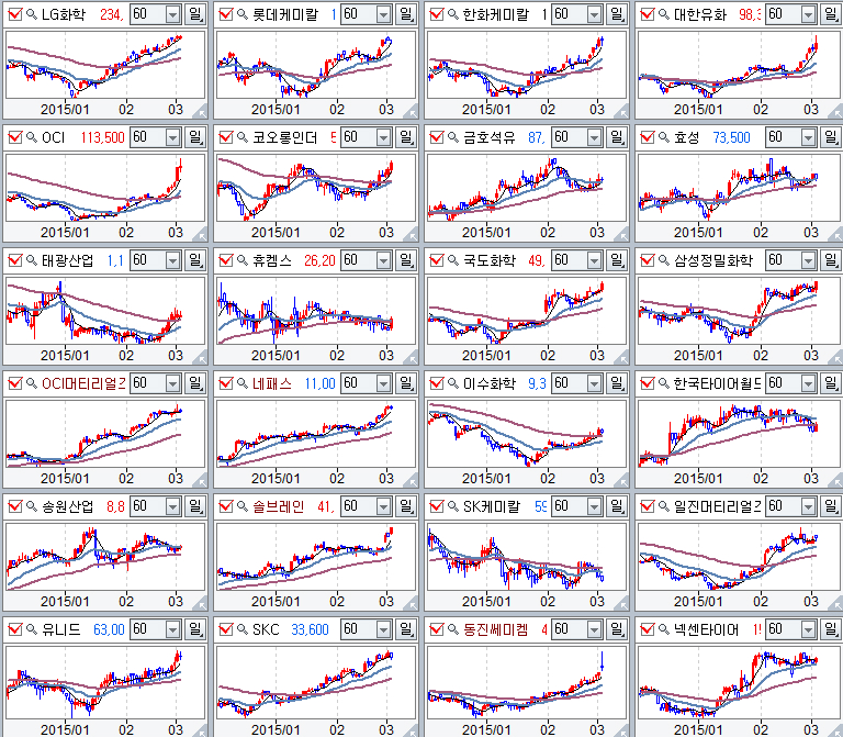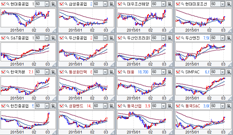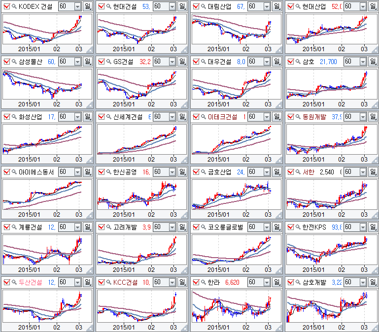 건설 활황에 의한 건설과 건자재, 갤럭시 6의 출시에 따른 스마트폰 및 부품, 세계 제조업 회복에 따른 경기민감주(중국주)의 회복 삼각 편대의 진용이 강화되고 있다.