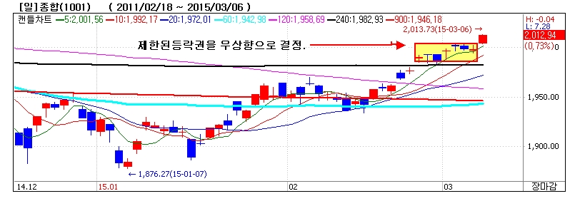 증권사를 중심으로한 지속적인 매물출회가 이어지고 있으나 외국인은 지속적인 매수세를 이어가고 있다. 3월의 첫주말인 오늘, 주말임에도 불구하고 시장부는 2000p를 돌파하면서 2012.94p에 마감을 하였고 코스닥은 4.41p오른 635.84p로 마감하였다.