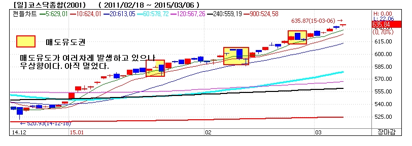 상기에 네모친 부분이 매도유도권이었다. 그럼에도 불구하고 조심하자는 말을 뒤로 하고 상승세을 이어가고 있다. 속칭 잡주로 분류되는 그룹이나 테마성으로 분류되는 종목들의 하락세는 나타날 것이나 시장주도권역에 속한 종목들의 폭락이 나타나지 않는 한 아직 한참 갈 것이다.