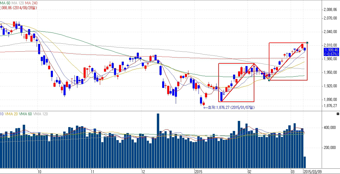 예상대로 거래소가 2000을 돌파했지만 문제는 안착할 수 있느냐 이다.