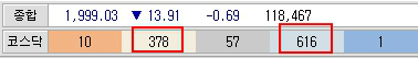 금일 코스닥 지수는 0.3%밖에 하락하지 않았지만 하락종목수가 2배나 많다.