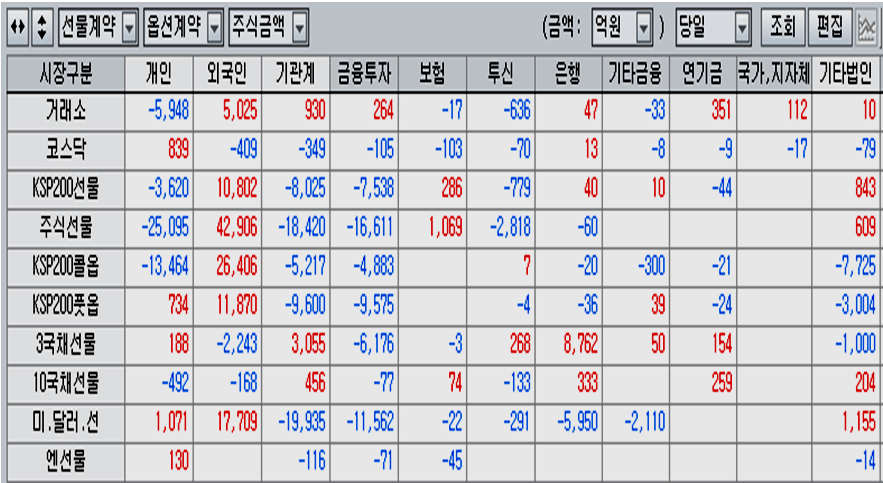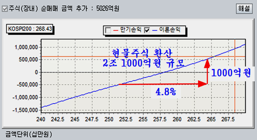 주식 선물을 제외한 현물주식과 지수선물 및 지수 옵션을 합한 외국인의 오늘 매수 포지션은 2조 1000억원의 현물 매수에 상응한다.