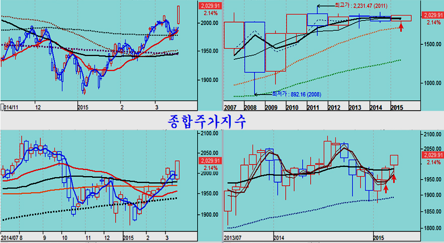 종합주가지수는 2.14%가 오르면서 2000을 넘어 지난해 10월 고점을 넘어섰다. 월간으로는 옵션만기 변동과 함께 월중 최저가격이 형성되는 시가3선에 저가를 맞춘 후 양봉을 그리며 상승하는 극히 자연스런 모습이 되었고, 연간으로는 드디어 주가가 연봉시가 3선을 넘어 본격적인 상승 추세 출발의 의미를 주고 있다.