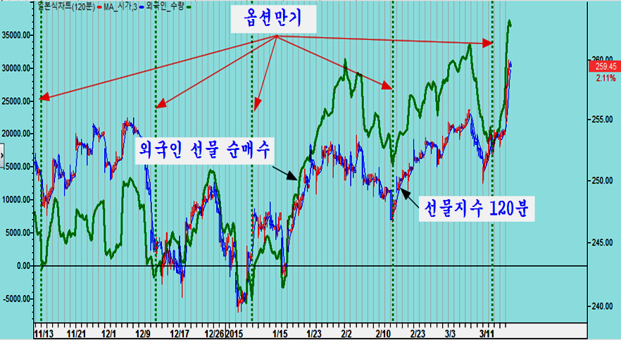 옵션 만기가 되면 상승을 기대하고 콜옵션을 사고 풋옵션을 파는 개인들 때문에 이익의 기회가 발생하는 것을 놓치지 않고, 선물 매도로 가격을 급락시켜 이익을 얻곤 주가를 제자리로 변동하는 단순한 변동이 반복되고 있다.