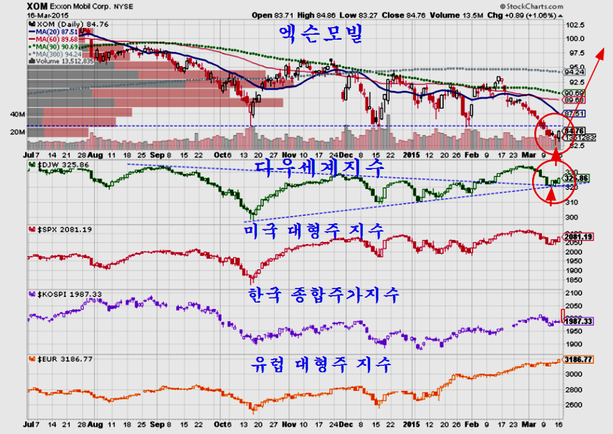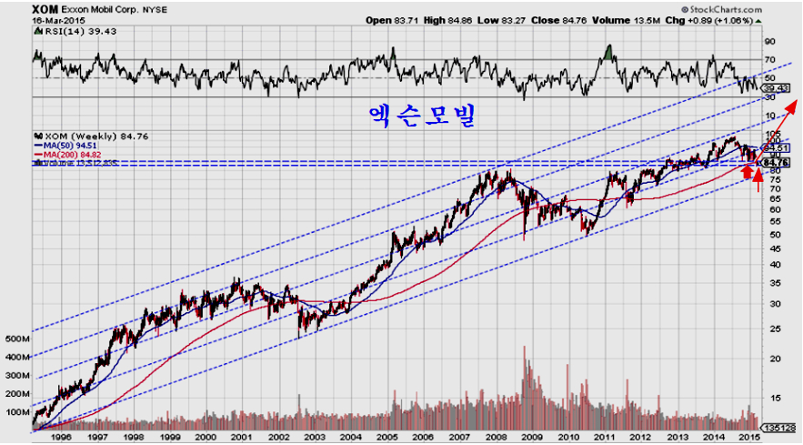 실제 엑슨모빌의 주가를 장기로 보면 2011년 이후 가격이 정체된 가운데 주가는 힘을 비축하고 있어서 강하고 긴 상승이 준비되어 있는 곳이다. 따라서 삼성전자와 현대차가 종합주가지수를 들어 올리듯이, 엑슨모빌은 뉴욕증시와 함께 세계 지수를 들어 올리는 가벼운 장세가 전개되기 쉽다.