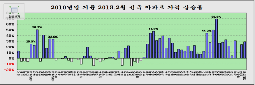 아직도 인구구조, 경제활동인구, 주택보급률 또는 20~30대의 낮은 소득에 의한 주택 매입 여력 부족으로 주택시장을 부정적으로 보는 사람이 있다면, 다음 주택가격 상승률을 살펴 보고 2010년 이후 아파트매내 갸격이 68.8%오른 경산이나 50% 오른 대구광역시, 그리고 20 ~ 40%씩 오른 지방의 각 도시들이 한국의 도시인지를 살필 필요가 있다.