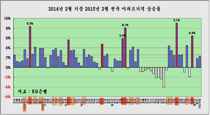 특히 상승률이 4.2%를 넘어 매우 빠른 상승을 보이는 지역은 경북 경산 9.1%, 대구 8.3%, 충북 청주 8.1%, 경남 김해 6.4%, 경기 광명 5.6%, 경기 이천 4.8% 지역이다. 대구와 경산의 경우 2010년 이후 누적 상승률이 커 최근의 급등은 투기적인 과열 기미를 보이고 있다.