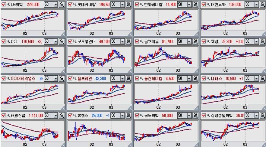 산업재 중에서 가장 업황회복이 빠른 것은 화학업종이다. 경기 회복과 함께 상품 수요가 증가하는 대신 원유가격 하락으로 원가가 하락하여 화학업종은 강한 회복이 나타난다. 특히, 석유화학과, 태양광, 전자화학이 강한 흐름을 나타낸다.