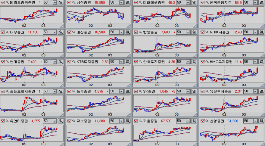 가치투자로 경재력 확대와 함께 상승을 선도하는 메리츠종금증권과 함께 증권주가 일제히 오르며 상승을 주도하는 모습이다. 증권주는 한 종목쯤 포트폴리오에 편입해 두면 좋다.
