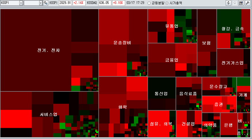 시장은 삼성전자와 현대차 등 대형주가 앞에서 이끄는 가운데, 건설, 증권, 은행의 트로이카와 화학, 조선의 경기 회복주가 이끄는 다축 주도의 장세이다.