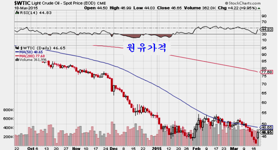 지루한 하락을 보이던 원유가격도 9.95%가 오르며 지루한 하락에서 벗어나 쌍바닥을 완성하며 상승으로 돌아섰다. 2014년 7월 이후 시작된 9개월간의 긴 조정 국면을 마무리하고 상승으로 전환되는 것으로 판단한다.