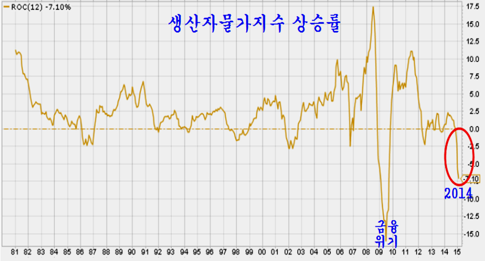 쥬라기 : 위에 있는 미국의 생산자 물가지수 마이너스 국면을 종합주가지수상에 타나낸 것입니다