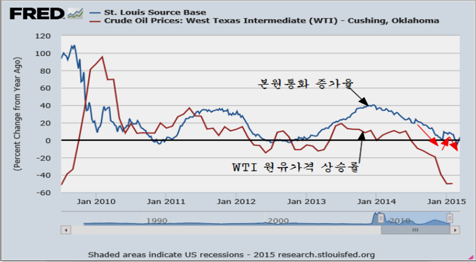 실제 원유가격 상승률과 본원통화 상승률을 비교하면, 원유가격 상승률이 본원통화증가를 따라 오르고 내림을 알 수 있다. 따라서 지난해의 원유가격 하락은 셰일원유 생산에 의한 수급 때문이 아니라 미국 FRB의 과도한 통화 긴축에 따른 가격 하락의 결과라고 할 수 있다.