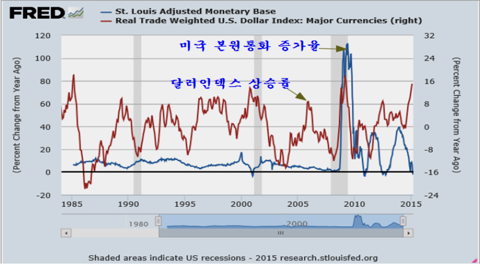 과도한 달러 강세 역시 FRB의 통화전략에 따른 의도적인 결과이다. 본원통화 증가율과 달러가치의 전년동기비 상승률을 비교하면 이런 관계는 뚜렷하게 나타난다. 즉, 달러 본원통화 증가율을 낮추면 달러가 강세로 움직이고, 반대로 달러 본원통화 증가율을 높이면 달러가 약세로 전환된다. 최근 달러의 가파른 상승세 역시 미국이 본원통화를 급격하게 감소시켜 나타난 결과임을 보여준다.