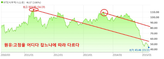 *국제유가는 2011년초에 WTI기준 114불까지 상승했고 지금까지 4년째 하락파동이 나타나고 있다.
