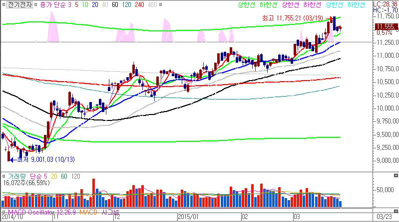 볼린저밴드 상단을 꾸준히 타고 오르면서 추가 매수세를 불러오는 형국이다