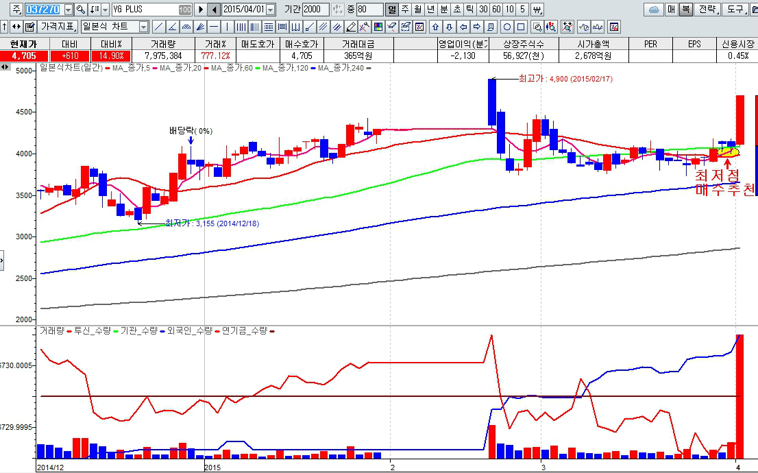 단기바닥권에서 매집징후 발생중. 화장품 사업 부각시 단기급등은 가능해 보입니다.