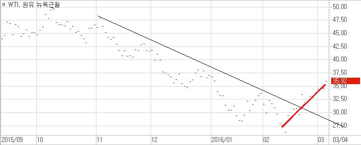 그동안 꺽어져 내려오던 원유추세를 돌파한 모습입니다.