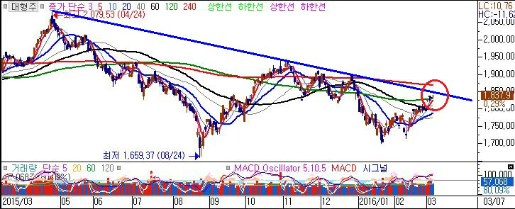 대형주의 경우는 상단 추세선의 돌파를 봐야겠고 돌파후 앞의 상승과 다르게 조정후 재상승을 확인해야 겠습니다.