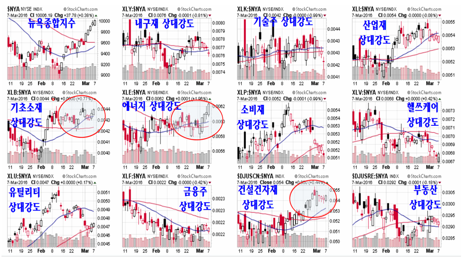 각 섹터(업종)의 지수를 종합주가지수로 나눈 상대강도는 종합주가지수에 비해 앞서서 움직이는 업종을 보여준다. 2월 말 이후 뉴욕시장에서 종합지수를 앞서서 시장을 선도하는 업종은 기초소재와 에너지 그리고 건설과 건자재이다. 이 업종이 시장을 앞서 나가면서 전체 시장을 이끄는 선도 업종이다.