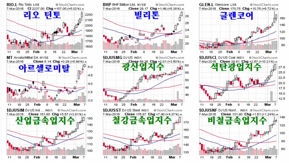 따라서 이들을 아우르는 광산업 지수, 광석의 제련을 위해 필수인 석탄광업은 함께 업황이 호전되고, 이들 광석을 제련하는 철강업과 구리와 알루미늄 같은 철이 아닌 다른 금속을 아우르는 비철금속, 철과 비철금속을 모두 포괄하는 산업용 금속 산업이 모두 강한 상승을 하고 있다. 이들 1차 금속 산업과 광업은 세계 각국의 주식 시장에서 종합주가지수를 앞서서 움직이는 선도 업종이다.