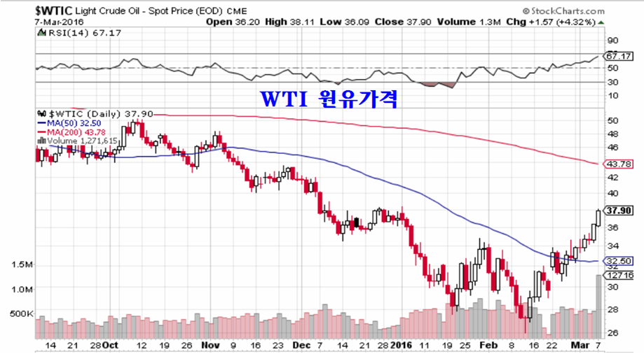 한편, 미국의 2012년부터 본격 개발된 셰일 유전이 생산 수명(3~4년)이 끝나가면서 미국의 원유 생산이 줄기 시작하고, 세계 경제가 회복의 움직임이 나타나자 원유 가격이 본격적으로 오르기 시작하고 있다.