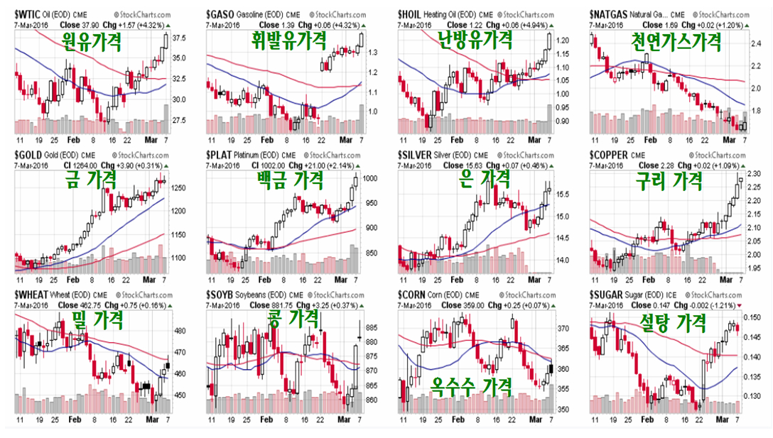 세계는 장기간 침체되어 있던 세계 중후 산업 경기가 회복이 되면서 가장 먼저 에너지와 금속 같은 상품 가격의 상승과 여기에 관련된 섹터의 상승이 시장을 선도하고 있다. 최근에는 하락하던 곡물까지 상승에 합세하며 전세계의 지속되던 디플레이션 종식과 인플레이션 국면 전환이 진행되고 있다.