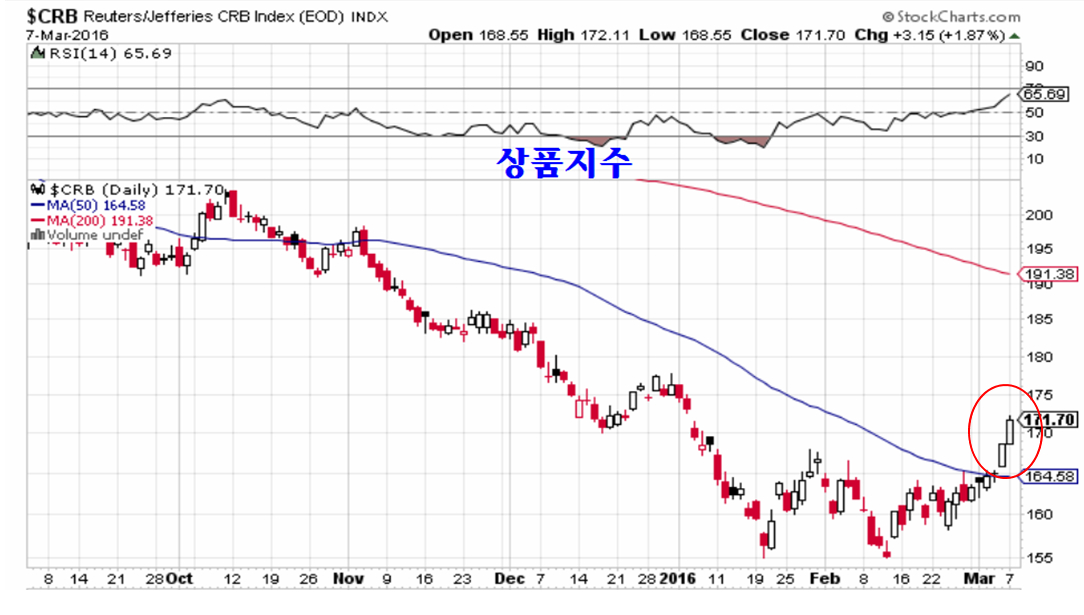 에너지 산업금속과 귀금속 곡물을 아우르는 상품 지수는 50일 평균을 넘어선 후 보폭이 빠른 상승을 하고 있다. 그간의 약세장 반등과 상승 추세의 불확실성을 걷어내고 본격 상승 추세로 진입한 것이라 할 수 있다.