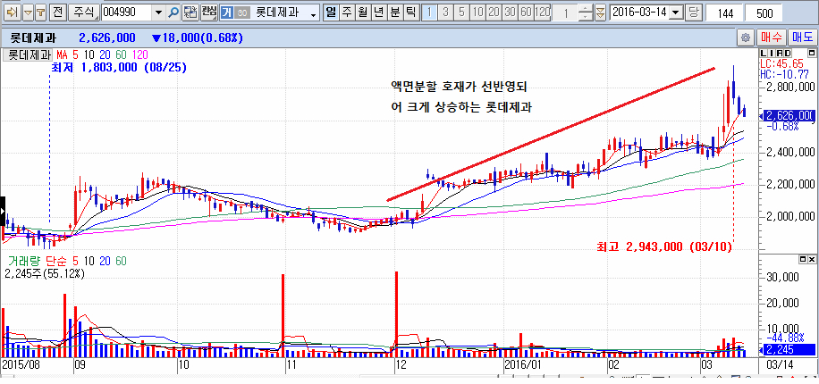 롯데제과는 계속해서 치솟으며 52주 신고가를 나날이 갈아 치웠죠. 액면분할 효과때문입니다.