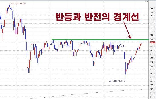 코스닥은 지난해 하반기 내내 저항되었던 위치로 다시 접근된 모습이다. 이상의 저항대를 놓고 다소의 공방을 벌이는 모습이 존재할 수 있으나 저항 강도가 높지 않다면 등락을 주다가(소극적 저항) 이를 돌파할 수 있다.