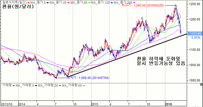 듯 하다. 지난해 10월이후 상승추세라인에 근접함으로 지지 가능성.(물론 환율역시 기술적접근