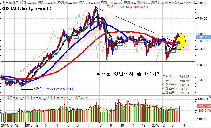 코스닥지수는 수직반등 이후 견조한 횡보조정을 보이고 있다. 거기다 제반 장단기 이평선이