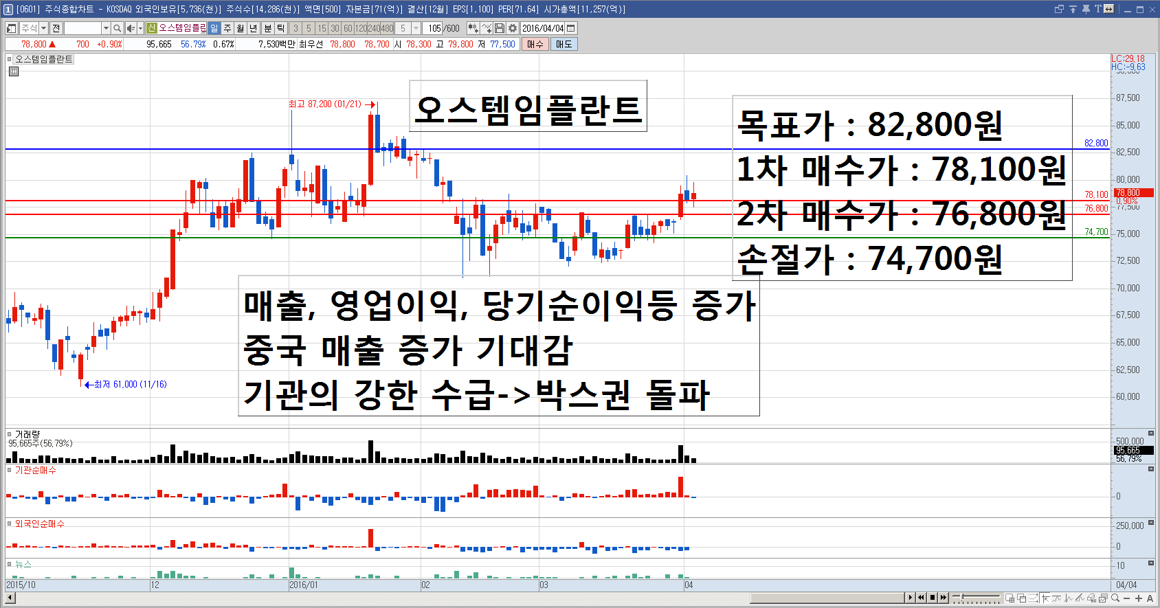 또한 3월 28일 장대 양봉 이후 3일간 기관과 외국인의 양매도로 하락 조정을 보였는데